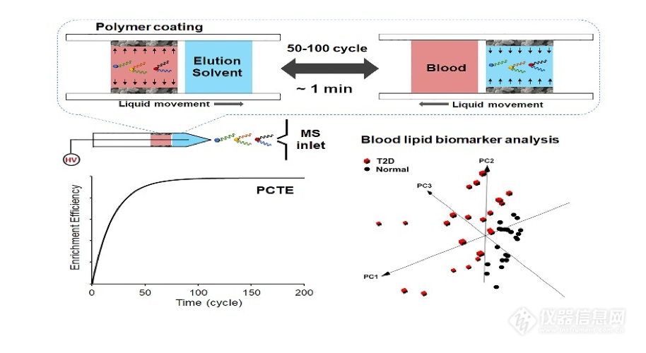 脂质是细胞膜的基本组成部分,是细胞能量的来源,也是炎症和代谢等细胞信号传导过程的重要介质。体液中的脂质含有丰富的代谢信息,脂质组的改变与癌症、心血管疾病和阿尔茨海默病等疾病的发展密切相关,它可以反映某些疾病的状态,可作为生物标记物。虽然已有的原位电离方法如纸喷雾法等已被用于体液分析,但由于解吸困难和电离效率低,所以并没有被应用到体液的脂质分析中。清华大学欧阳证、瑕瑜教授与普渡大学长期合作,致力于小型质谱系统、原位采样电离及脂质分析方法的开发。针对体液脂质分析的问题,该团队使用共价键合修饰、快速原位聚合的方法制备了一种新型的聚合物涂覆电喷雾毛细管,提出了一种新的直接微采样技术:聚合涂覆转移富集(PCTE)。该方法不仅可以快速(1 min)、灵敏、定量地进行脂质质谱分析,还能对少量生物体液脂质C=C位置异构体进行鉴定。该方法在临床检测等领域中具有极大的应用前景。