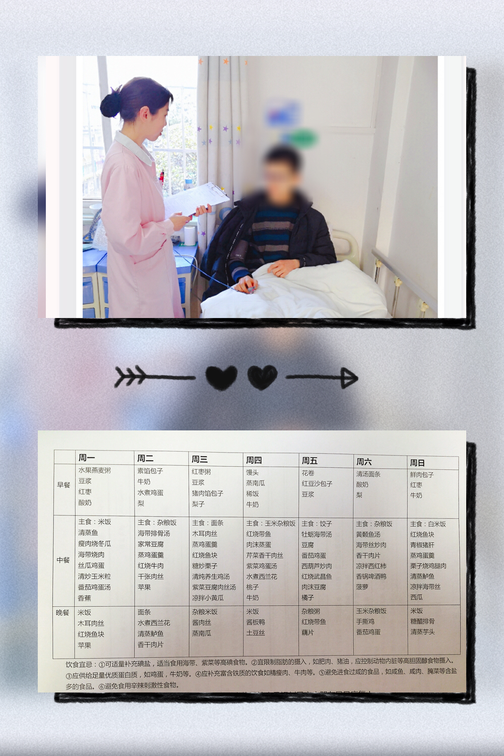 走进国药东风总医院儿科一病区,健康宣教栏里放着由五颜六色的彩纸印刷而成的儿科常见疾病健康指导,病区的墙面上也张贴着图文并茂的疾病知识宣传。但是今天我想说的是我们针对一位小朋友而写的饮食指导,这究竟是一份什么样的饮食引导呢,里面又有什么不一样呢?没有煽情的陈词烂句,没有枯燥的医学术语,有的是我们专业与重点的讲解和简明扼要的三餐食谱。当这位甲状腺低下的13岁患儿和他的妈妈从护士手上接到这份食谱时,由衷的开心。