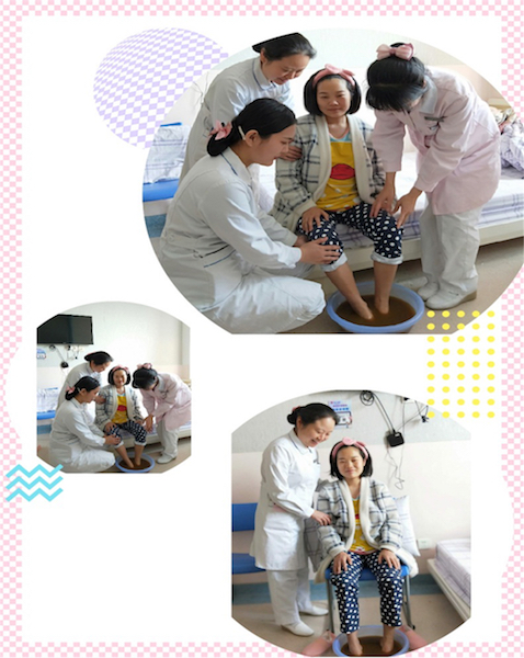 病房一角,李老师正在给产妇讲解中药足浴的作用及足浴前注意事项,这时产妇已经迫不及待了。家属拿出事先准备好的足浴盆,搀扶产妇坐在合适的凳子上,在护士长及几位护士的指导下,产妇洋溢着笑容享受着愉悦的足浴时光。