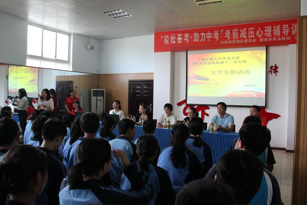 5月21日下午,第十二党支部与十堰市第九中学党支部结对,联合第九中学共青团开展了主题党日活动,本次主题党日主题是“轻松备考、助力中考”考前减压心理辅导讲座,此次活动为了让初三毕业生的学生在紧张繁忙的学习中释放压力,体验携手共进的快乐,共同迎接中考的到来。