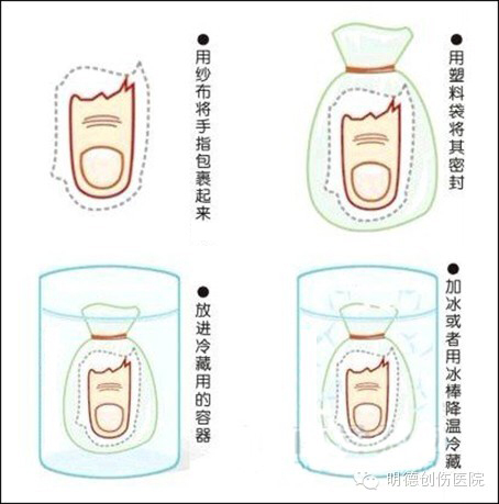 远地伤员保存:把断指用8层无菌干纱布包裹,然后放入无漏孔的塑料袋内,扎紧袋口,使袋口朝上放入冰筒或放入装有冰块的器皿内,这样保存较理想。