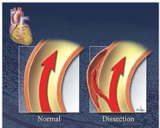主要的症状为疼痛,几乎所有意识清楚的病人都会有疼痛,疼痛发生突然且剧烈,常被描述为撕裂或剥开样,常位于胸前区、肩胛间区、腰背痛、腹痛;有时夹层撕裂的症状与急性闭塞的动脉相关如脑卒中,心肌梗死或小肠梗死,到脊髓的血供受影响引起下肢轻瘫或截瘫,肢体缺血。