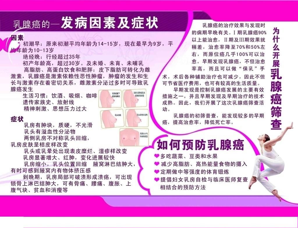 乳腺癌市妇女最常见的恶性肿瘤之一。乳腺癌的发病率在不断上升。由于治疗方法的不断改进,特别是综合治疗的广泛应用,治疗效果有了明显的提高。乳腺癌发病的相关因素包括:肿瘤病家族史,尤其市母亲、姐妹或姨妈患乳腺癌病史;月经初潮年龄过早,绝经年龄晚;高脂高蛋白饮食习惯;乳腺的某些良性疾病。