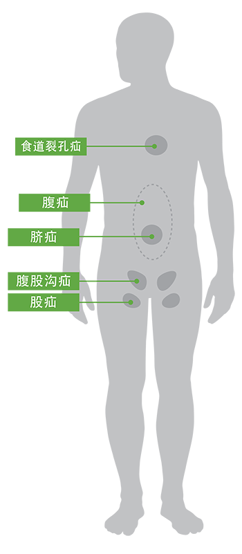 腹外疝是由腹腔内的脏器或组织连同壁腹膜经腹壁薄弱点或孔隙,向体表凸出所形成。常见的有腹股沟疝、股疝、脐疝、切口疝等。