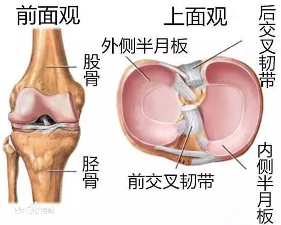 膝关节有内外侧2个半月板,位于胫骨平台内侧和外侧的关节面,膝关节运动时起缓冲作用。
