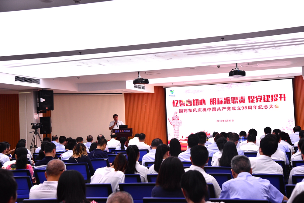 2019年6月27日下午,国药东风纪念建党98周年庆祝大会隆重召开。国药东风党员干部200余人齐聚一堂,共同缅怀党的光辉历程,重温誓言守初心,明晰职责勇担,以推进基层党组织标准化建设为切入点,以高质量党建为助推器,坚定不移推动全面从严治党向纵深发展。