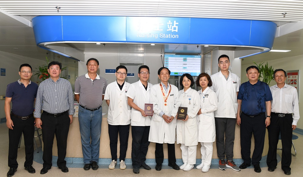 上午10点,国药医疗副总经理、国药东风总经理何宏生,国药东风党委书记杨汉东,国药东风总医院党委书记李斌、党委委员李鹏率相关职能部门负责人,来到位于住院部A16楼的戴宗晴工作室,为戴宗晴教授颁发纪念章。