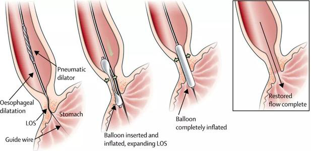 操作方法是胃镜进镜至狭窄处,镜身不能通过,在胃镜下,先通过扩张的导丝,把导丝通过狭窄的部位,在导丝的引导下,将球囊送入,使球囊中部置于狭窄处,打水充胀球囊在狭窄处进行扩张,依次加大压力,缓慢加压,留置五分钟,狭窄经过外力的作用,使食管扩张,镜身能顺利通过,扩张有效。