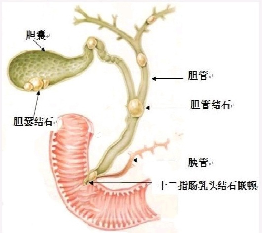 肝外胆管结石可分为原发性和继发性两种。原发性占大多数,指原发于胆管系统内的结石,多数为胆色素结石或混合性结石;继发性指胆囊内结石排至胆管内,多数为胆固醇结石。大多数胆管结石患者都有在进油脂食后、体位改变后发生胆绞痛,这是因为结石在胆管内向下移动,刺激胆管痉挛,同时阻塞胆汁流过所致。