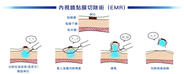 方法二:内镜下黏膜切除术(EMR):是指内镜下将病变黏膜完整切除的手术,是一种结合内镜下息肉切除术和内镜黏膜下注射术发展而来的治疗方法,属于择期诊断性或根治性手术。手术旨在通过大块切除部分黏膜(深度可达黏膜下组织)诊治黏膜病变。