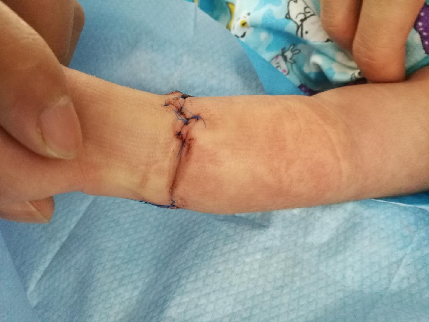 余化龙主任说,“责任重于泰山,医生的责任感和使命感让我们必须认真的对待每一个患者,我们应当按照科学方法,尽早解除患儿的痛苦”。针对患儿皮肤嫰、血管及神经细、手术部位环形缩窄,手术中易受创伤的特点,经多方论证,确定了“静吸复合全麻下行左腕部束带切除+腕管松解+皮肤Z字成形术”,术后立即转新生儿监护室护理的手术方案,手术由余化龙主任和李汉湘教授亲自主刀,抽调科室业务精、技术熟的医护人员全程服务,确保万无一失。