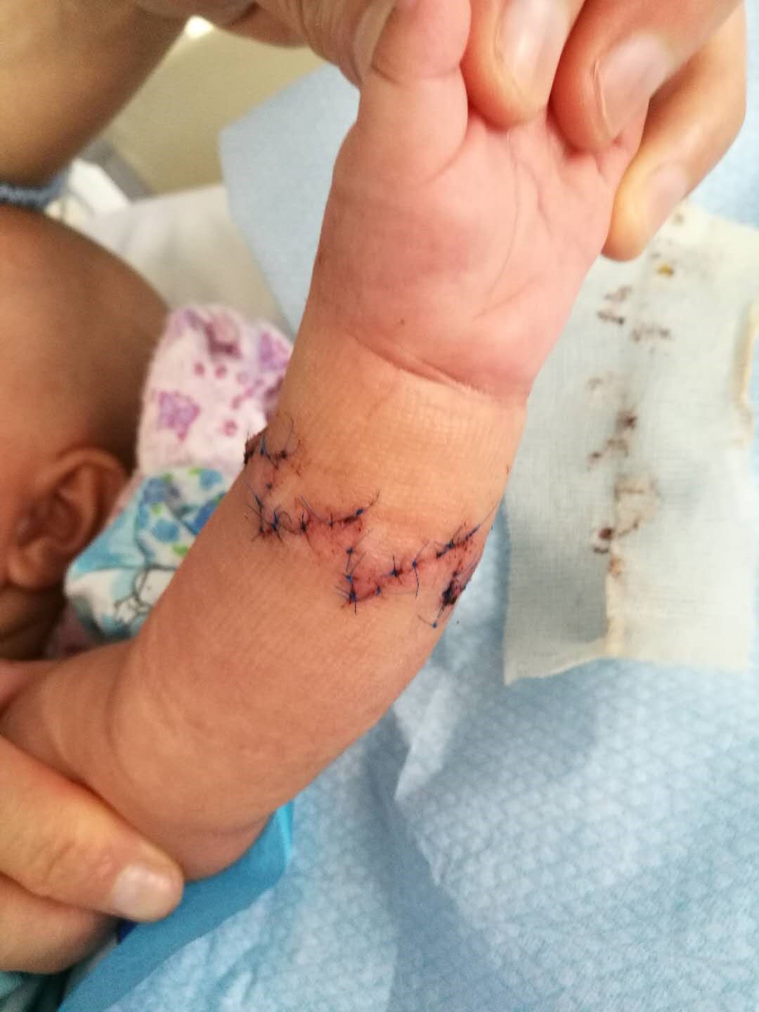 5月27 日,国药东风总医院手足踝显微外科接诊了一个出生仅40天的女婴患儿。患儿家长陈述,女婴叫苒苒,竹溪县龙坝镇红庙村人,小苒苒是陈家长女,她的出生给这个农村小家庭带来了巨大的欢乐和喜庆,父母视其为掌上明珠,爱不释手。喜庆之余,医生告诉家长苒苒的左手腕处有一道很深的环状畸形带,经多家医院检查,认定这个环状畸形带会随孩子年龄增长而长大,不仅会影响女孩的形象,更会严重影响左手功能的正常发挥,造成肢体残疾。得知病情,一家人顿时感觉天都要塌下来了,患儿父母愁肠百结,茶饭不思,带着爱女八方托人,四处求医,但因女婴太小,手术风险大,医疗技术有限等多种因素影响,辗转多家医院无人接治,后经人介绍,才寻医国药东风总医院手足踝显微外科。