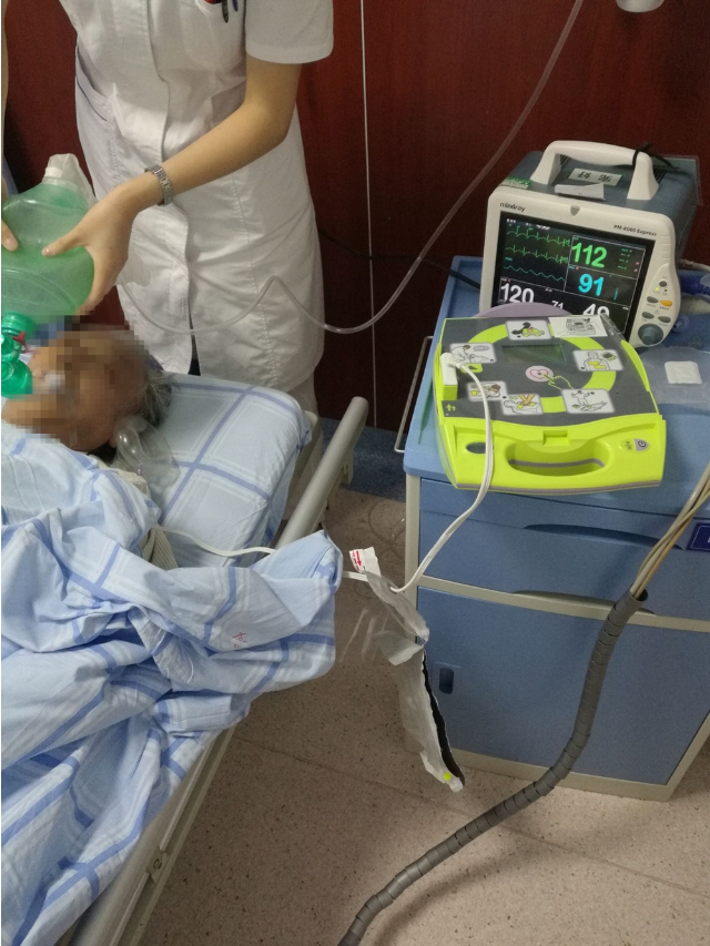 患者呼吸、心跳骤停!危难之际,医护人员沉着冷静,立即行徒手心肺复苏。护士火速从病区走廊取来AED,结合AED的指令,医护人员轮流一刻不停地为患者进行体外心肺复苏、球囊辅助通气。