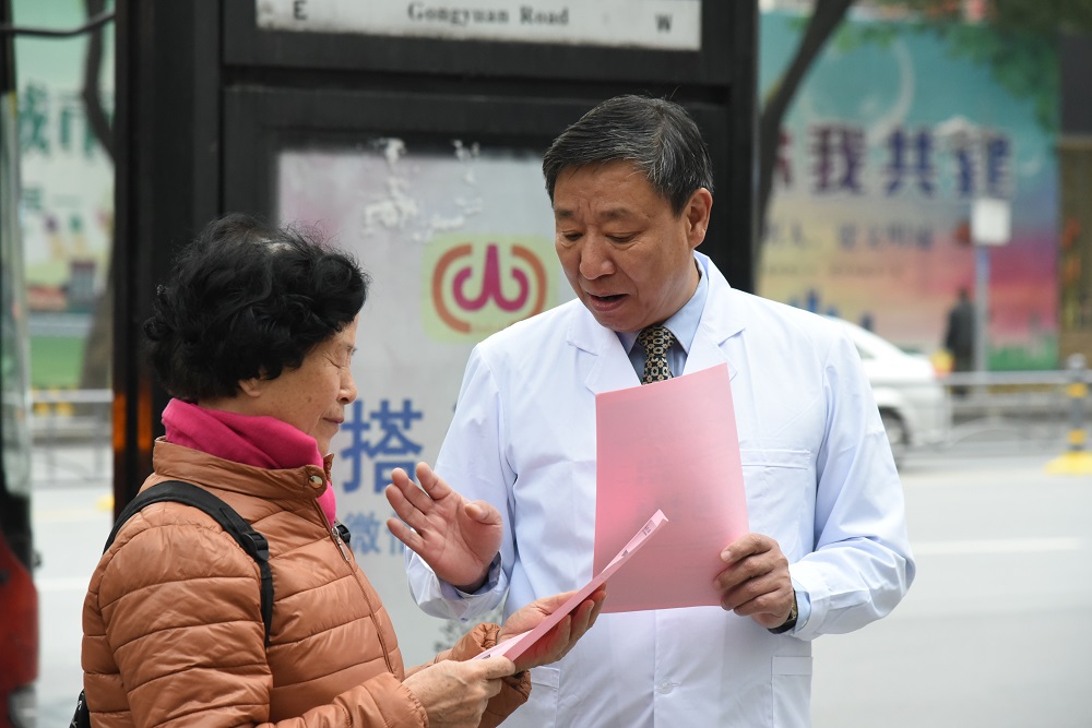 下图为医务人员向过往路人分发传单,普及心梗急救和防范常识。