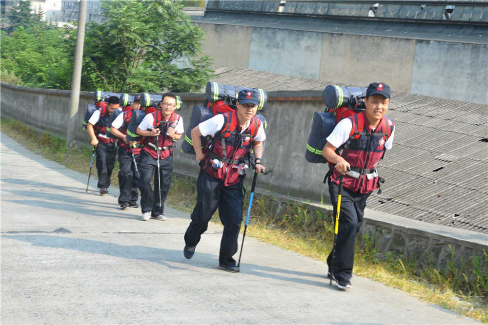 身穿救援服,头戴救援帽,背负16公斤的救援装备,顶着炎炎烈日,快步行走在蜿蜒的山道上,汗水浸湿衣服也全然不觉,肩膀勒破皮肉也一声不吭……
