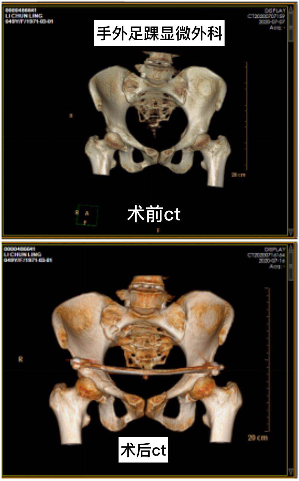目前,髂前下棘椎弓根钉棒内固定治疗骨盆前环骨折这一技术只有国内大型医院开展。该科医生黄成校于2018年9月至2019年3月在北京积水潭医院创伤骨折进修学习半年,学到了创伤骨科很多先进的治疗方法。接诊到这位病情复杂的病人时,他想到了在积水潭医院学到的INFIX技术治疗骨盆前环骨折很适合这位患者的病症,于是决定采用这一新技术。术前刘亚东副主任、黄成校副主任医师、丁非凡住院医生等团队经过术前讨论、充分准备、周密计划,为患者实施骨盆骨折髂前下棘椎弓根钉棒内固定术,手术在1小时内完成,术中几乎无出血,手术十分顺利。手术次日患者即感双髋部活动较前轻松、疼痛明显减轻、可自行翻身活动,术后三日即可坐起,患者及家属对手术效果非常满意。