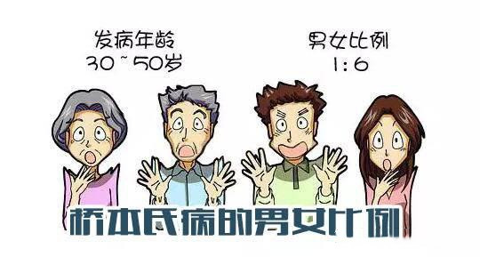 桥本氏甲状腺炎是一种常见的甲状腺自身免疫性疾病,可见甲状腺肿大或结节,临床表现为甲状腺功能亢进症,或甲状腺功能减退,发病率从0.3%-10%不等,30-50岁约占56%,男女发生比例1∶6,育龄期患者易导致胎儿畸形。