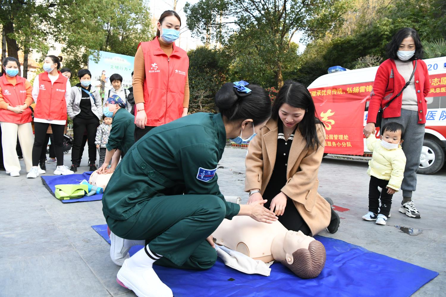 理论讲解结束后,国药东风总医院急救医学部主管护师张汉等急诊专家、志愿者来到人民公园广场,现场演示教学徒手心肺复苏,让大家在轻松愉快的氛围中掌握基本救护知识和急救操作技能,赢得现场观众的阵阵掌声。不少市民参与其中,体验了现场操作。