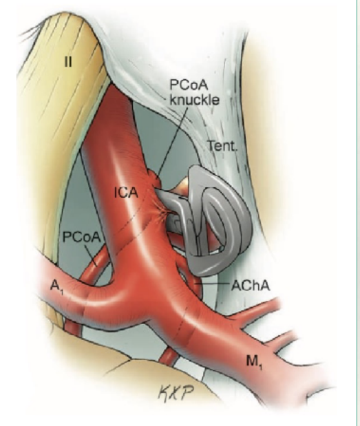 ②间接手术系指结扎颈部动脉的手术,本法适用于海绵窦内动脉瘤或其它不能夹闭的巨大动脉瘤或梭形动脉瘤,结扎前必须做Matas试验与造影了解颅内前后交通动脉侧枝循环情况,只有患者能耐受颈内动脉闭塞,造影证实颅内侧枝循环良好时,方可结扎颈动脉,否则会发生脑缺血并发症,甚至死亡。对不能耐受结扎术者,可先行颅内外动脉分流术,待其侧枝循环建立后,再考虑行颈动脉结扎术。结扎分急性结扎与慢性结扎两种,前者是指在短期内(数分钟至数小时)完全阻断动脉,后者是指采用特制的可调节的颈动脉夹,如Selverstone夹,在较长时间内(数天至10余天)逐渐将动脉阻断。
