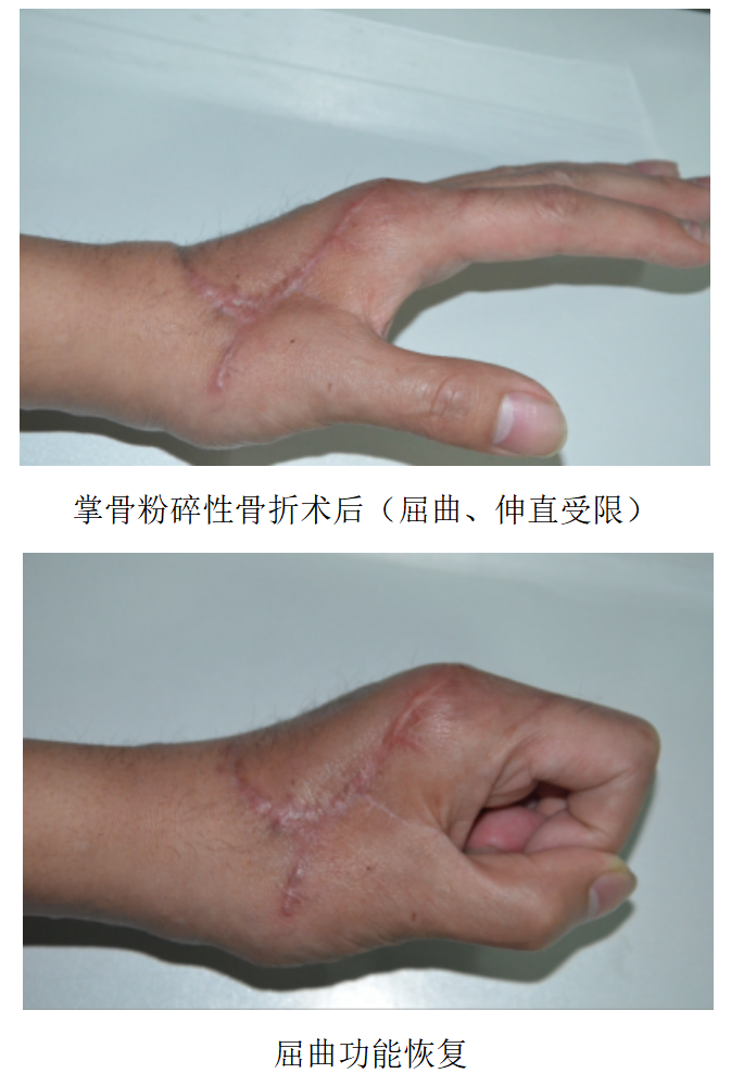 在手外科康复治疗中应重视功能训练,目前,我科已运用各种康复治疗技术,手法治疗、作业疗法、神经刺激、中药浸泡、理疗等方式对患者早期介入康复训练,来改善患肢的功能障碍,下例是我科对一名掌骨粉碎性骨折术后功能障碍患者行手外科康复后的对比图。