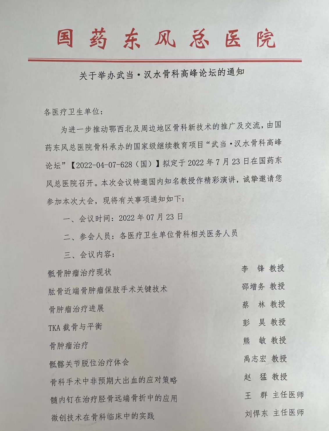 为进一步推动鄂西北及周边地区骨科新技术的推广及交流,由国药东风总医院骨科承办的国家级继续教育项目“武当·汉水骨科高峰论坛”【2022-04-07-628(国)】拟定于2022年7月23日在国药东风总医院召开。本次会议特邀国内知名教授作精彩演讲,诚挚邀请您参加本次大会,现将有关事项通知如下: