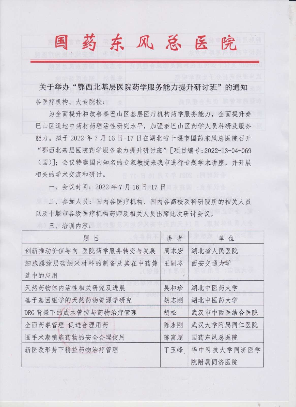关于举办“ 鄂西北基层医院药学服务能力提升研讨班 ”的通知