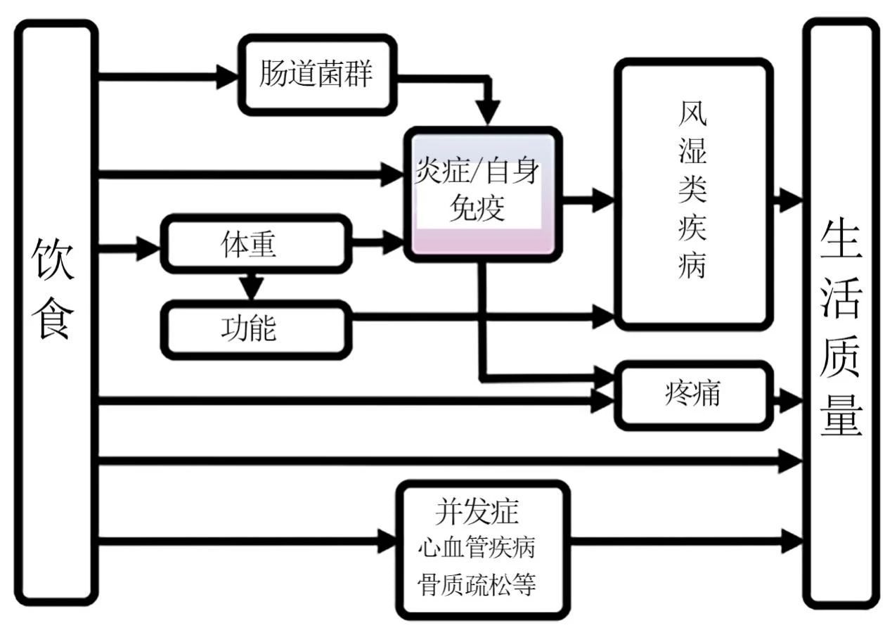 人体的免疫细胞大多数位于消化道,而营养物质(维生素、盐、脂肪酸等)或可改变肠道的通透性,并对肠道免疫细胞造成直接影响,肠道中活化的免疫细胞进而迁移至关节和其他组织,最终有可能导致风湿病的发生。