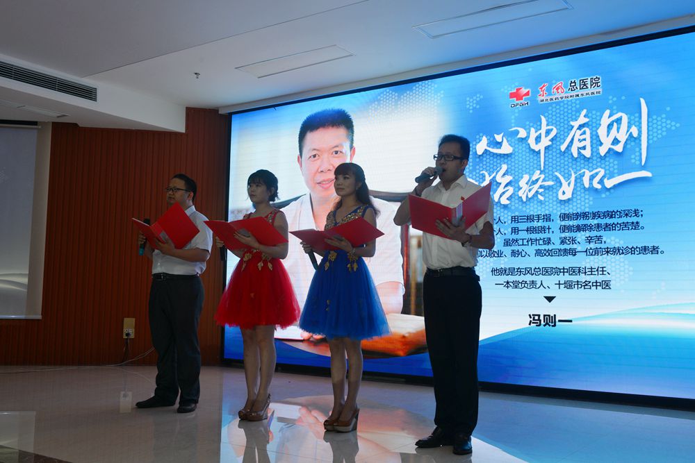 庆祝大会上,来自国药东风三家医院的医护人员登台演出。表演内容以大合唱、诗朗诵、小品、沙画等多种形式,娓娓道出国药东风总医院道德模范李守宏、冯则一,东风花果医院道德模范王万民,东风茅箭医院道德模范万雨明在医疗岗位上救护患者、默默奉献的感人事迹。现场,观看演出的医护人员畅谈了4位道德模范在日常工作中严以律己、迎难而上的模范先锋精神。(黄小凡)