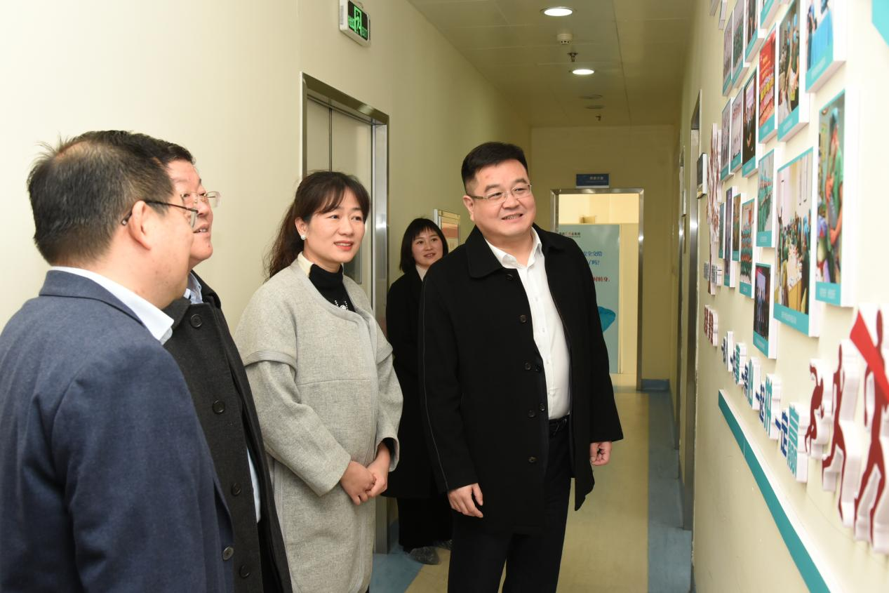 下列图为国药医疗党委副书记、总经理孙建一行参观麻醉手术室党建文化墙。