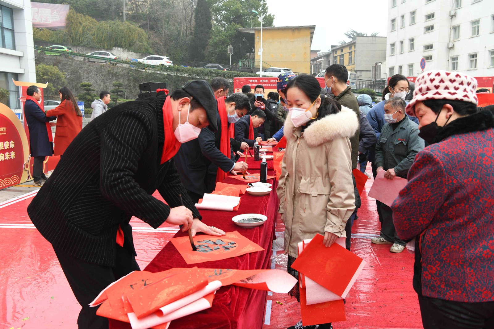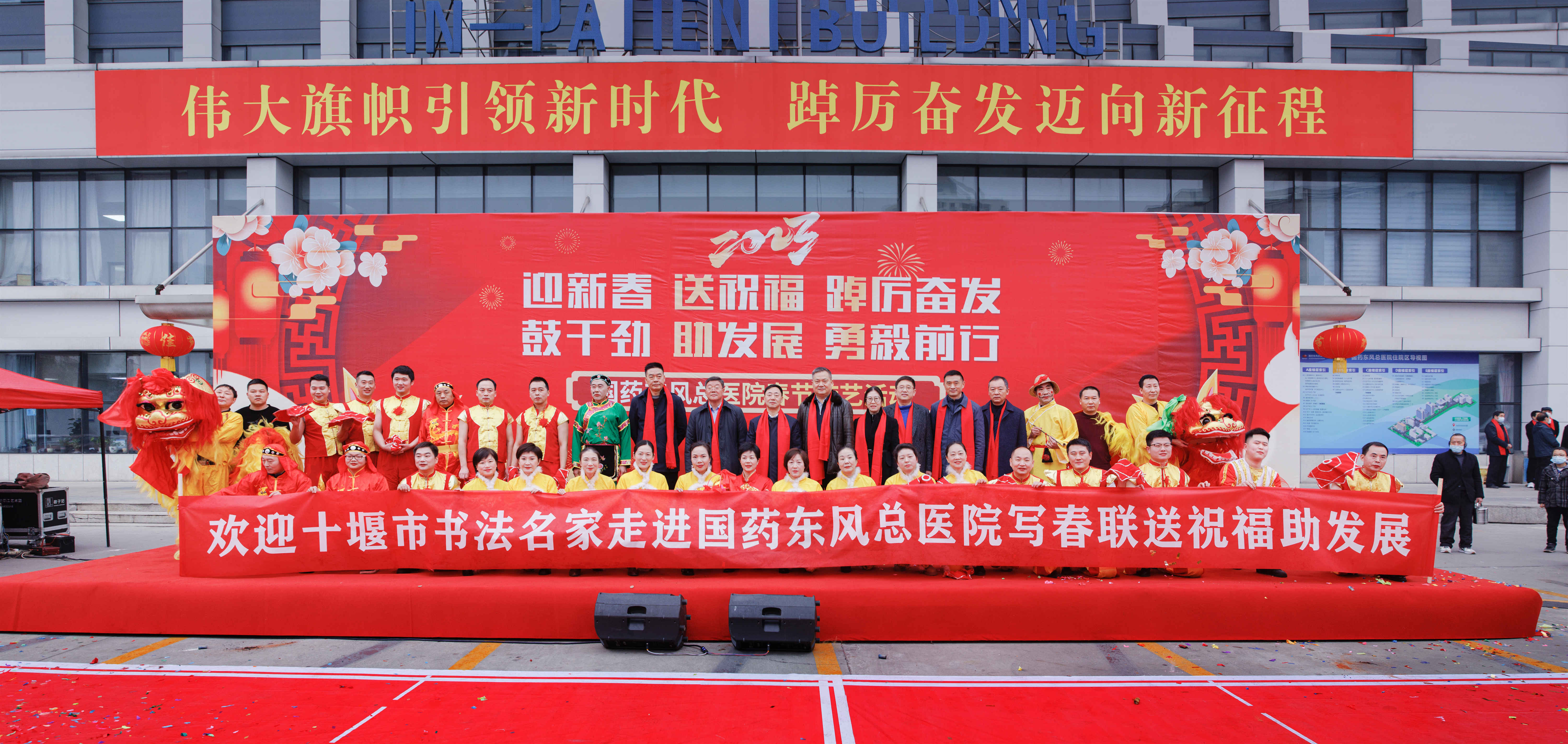 本次活动特别邀请了原十堰市人大常委会副主任、市书协名誉主席刘学华,市文联党组成员、常务副主席操建华,市美协主席李发山,中国书法家协会会员、市文联文学院院长、市书协常务副主席李永涛,市书协副主席刘端文,中国书法家协会会员、市书协副主席刘国平。几位书法名家现场挥毫泼墨,向广大职工及就诊患者和家属赠送春联。
