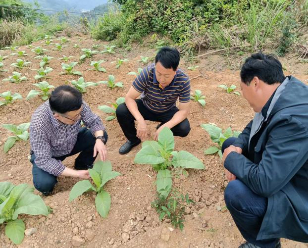 下图为在烟叶基地查看烟苗长势和竹膳房加工厂