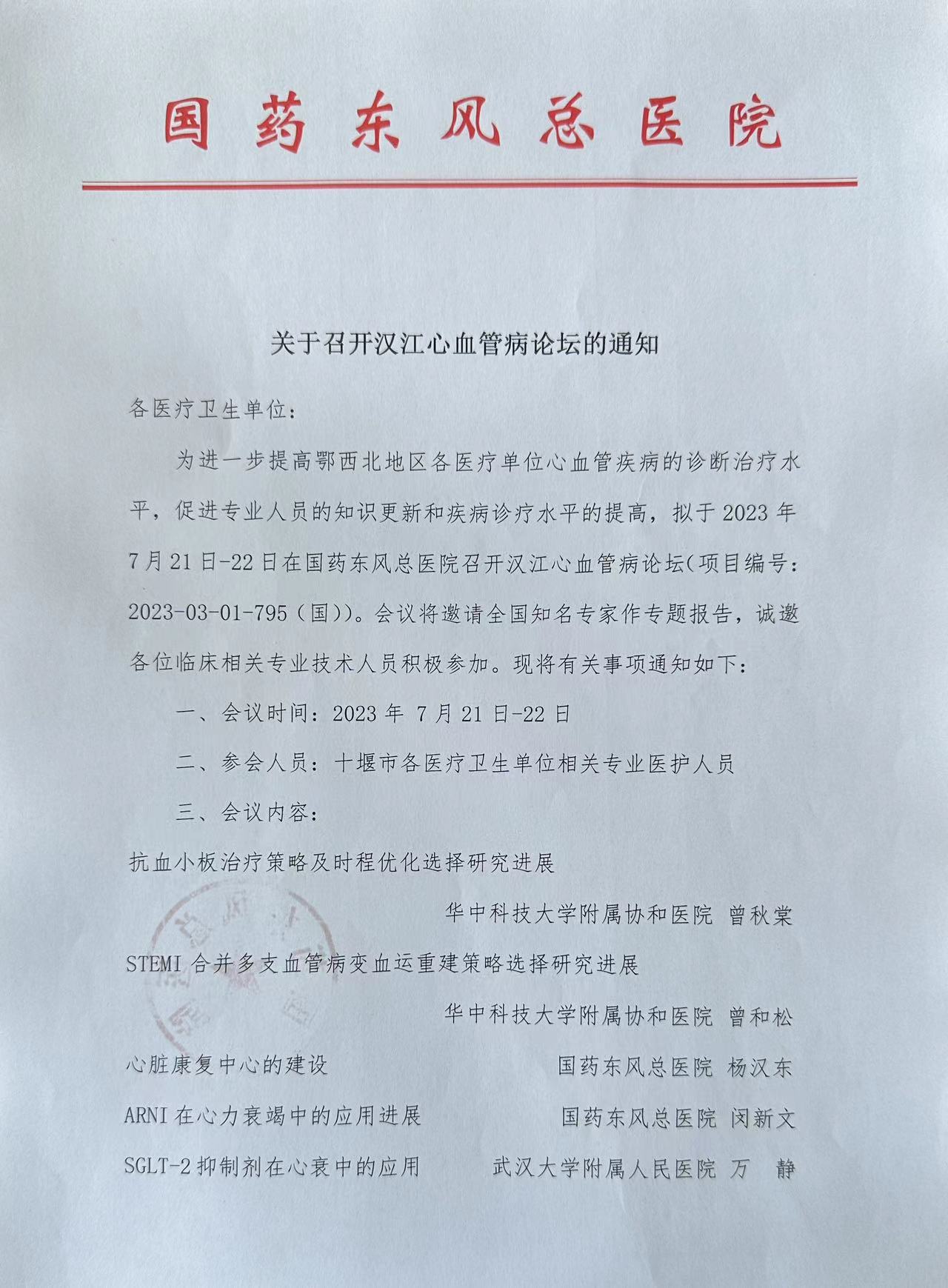 为进一步提高鄂西北地区各医疗单位心血管疾病的诊断治疗水平,促进专业人员的知识更新和疾病诊疗水平的提高,拟于2023年7月21日-22日在国药东风总医院召开汉江心血管病论坛(项目编号:2023-03-01-795(国))。会议将邀请全国知名专家作专题报告,诚邀各位临床相关专业技术人员积极参加。现将有关事项通知如下: