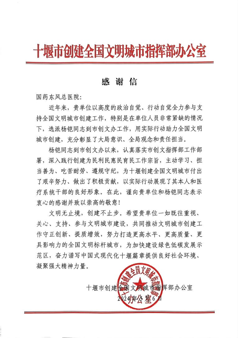 近日,十堰市创建全国文明城市指挥部办公室专门致信国药东风总医院,感谢总医院对十堰市创文工作的支持与协助。数年来,作为央企辖属的大型三甲医院,总医院始终牢牢秉持公益属性,持续发挥央企医院“国家队、主力军、顶梁柱”作用,在全市精神文明创建工作中贡献了蓬勃力量。