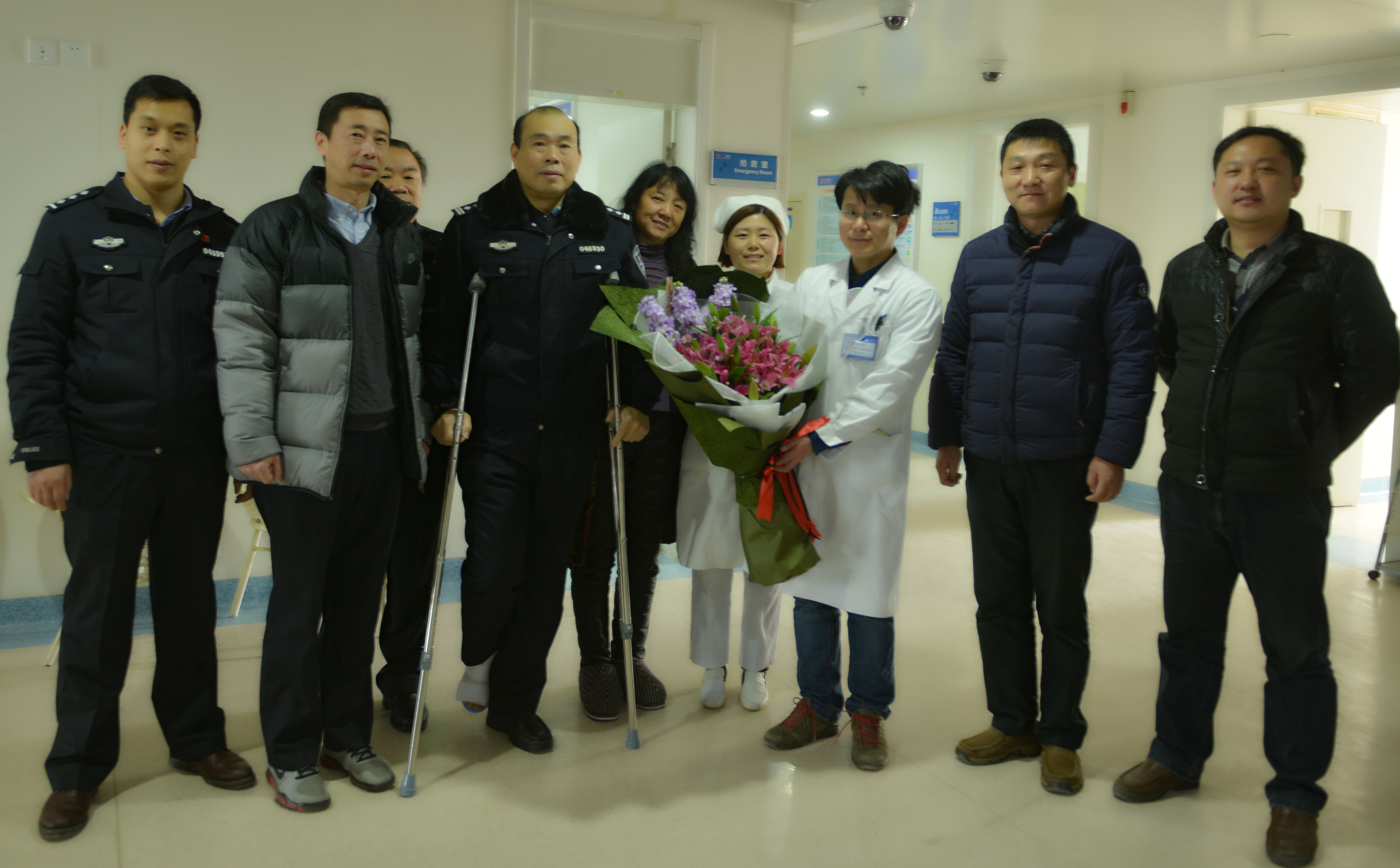 1月31日下午,在国药东风总医院手足踝显微外科病房里,因救人受伤的东岳分局北区派出所民警鲁志学亲手将一束鲜花送到该科主任余化龙手里,向医务人员表达了诚挚的感谢,为国药东风总医院点赞。