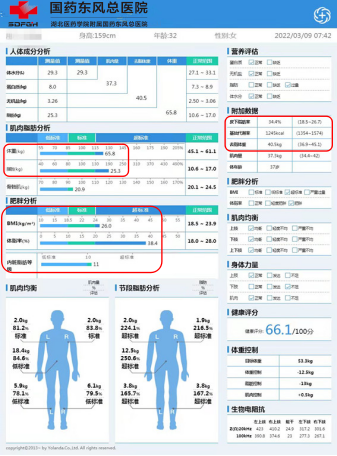 李老师同样也是一位医务工作者,虽然没有夜班,但基本不能按饭点吃饭,正常的饭点她还在忙着,中午1点下班,晚上6点下班,到家近7点,下班了吃完晚餐基本上也是一点不想动,这种生活方式及工作压力让她的体重逐年增长,曾经也靠节食减重体重1个月下降近10多斤,但恢复饮食后体重增加的更多,她逐渐出现体重焦虑。一样的筛查和评估过程,李老师虽然体重仅达超重水平,但体脂率高达38.4%,也是一位健康、隐形的“胖子”。我们来看看李老师干预前的体成分: