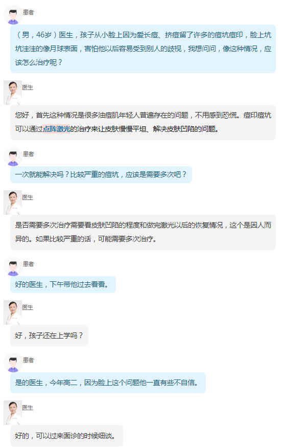 以上的聊天对话经常出现在科室咨询里,当然,有的是不小心受伤后出现的瘢痕,有的是小时候烫伤后留下的瘢痕,更多的还是青春期长痘护理不当留下的痘坑痘印。不要慌,点阵激光帮您解决!