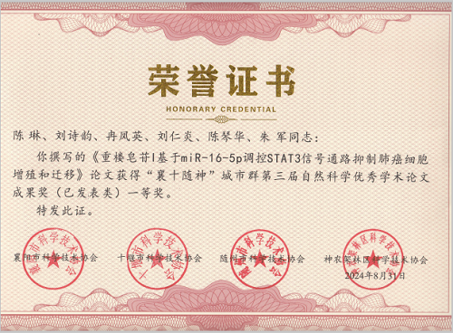 近日,“襄十随神”城市群第三届自然科学优秀论文成果奖评选圆满落幕,国药东风总医院药学部主任药师朱军团队所著论文《重楼皂苷I基于miR-16-5p调控STAT3信号通路抑制肺癌细胞增殖和迁移》荣获一等奖。