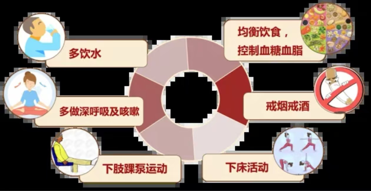 1.基本预防:早活动,早下床,戒烟酒,多饮水,控制血糖,调节血脂。下肢无血栓形成者做被动、主动运动。麻醉未醒或不能自主活动的患者给予按摩下肢和被动踝泵运动。