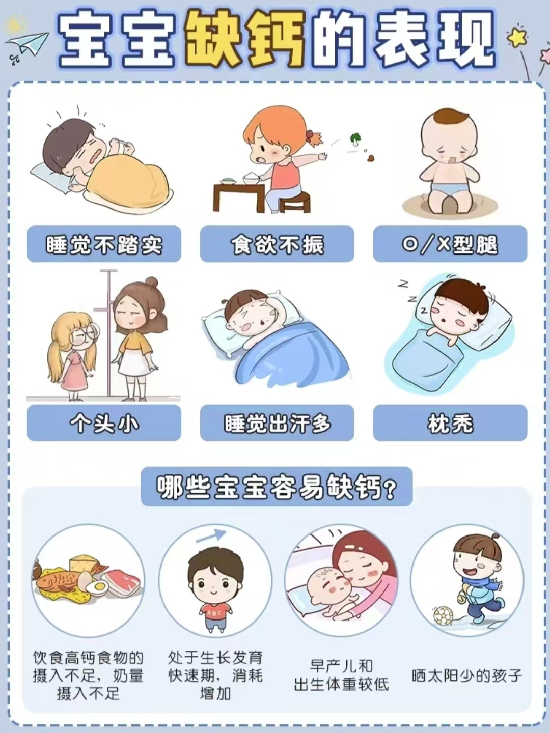 婴幼儿缺钙的表现很多,早期出现一些神经精神症状,如易激惹、烦燥、睡眠不安、夜间哭闹、多汗、睡眠时摇头等。进一步发展造成骨骼改变,如颅骨软化、方颅、前囟门增大及闭合延迟、出牙晚、鸡胸、漏斗胸、四肢畸形(“O”型腿或“X”型腿等)、骨盆成扁平状等。另外婴幼儿缺钙还会引起肌肉松驰,肌张力低,头颈软弱无力,坐立行机能发育落后,韧带松驰造成大关节过度伸展,肌张力低造成腹部膨隆,大脑皮层功能异常影响智力发展,表情淡漠,语言发育迟缓,免疫力低下易伴发感染等。