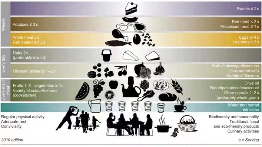 地中海饮食泛指希腊、西班牙、法国和意大利南部等处于地中海沿岸的欧洲国家饮食,是一种以蔬菜水果、鱼类、五谷杂粮、豆类和橄榄油等植物性食物占主体的膳食模式。地中海饮食金字从下到上分别为: