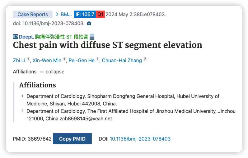 2024年5月2日,一篇题为《chest pain with diffuse ST segment elevation》(《广泛ST段抬高的胸痛患者》)的病例报道在国际顶级综合医学期刊《英国医学杂志》(The BMJ)(2023年影响因子/JCR分区:105.7/Q1)在线发布,影响因子创下国药东风总医院多年来科研论文之最。