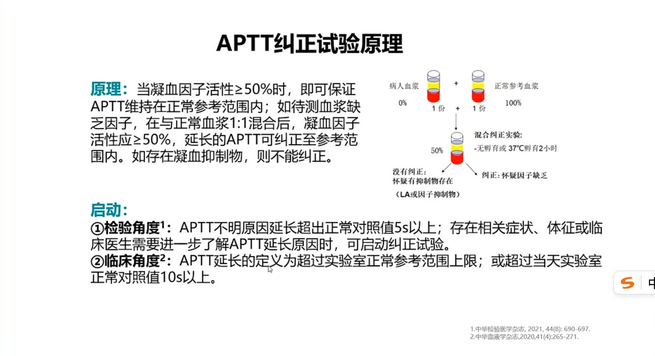 APTT纠正实验分即可纠正和孵育后纠正两部分,结果报告常用百分比纠正法或罗斯纳指数(RI)两种方法种的任何一种方法来判断。通常从以下三点来思考,具体工作中还需具体情况具体分析: