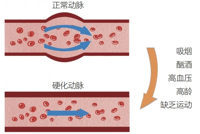 动脉是从心脏发出的不断分支的血管,起于心脏,分支延长,止于身体各组织内,负责将血液由心脏运送至身体各处。动脉的管壁会随着年龄增长发生硬化,通常在青少年时期就开始变硬,中老年时期硬化程度显著加重。动脉这种随年龄增长而出现的硬化就属于血管衰老,也叫动脉硬化。不良的生活习惯、不良情绪、疾病等带来的刺激,会导致血管硬化加速,超过年龄增长的速度。比如66岁的张阿姨,血管已经加速硬化到80多岁,这就是血管早衰,血管的年龄比身体的年龄大。医生询问后发现,张阿姨经常废寝忘食地工作,熬夜、工作压力大,血压高了很多年。导致她年龄66岁,血管80多岁;但只要她遵医嘱,按时服药,自此保持良好的生活习惯,血管衰老的速度也会减慢。