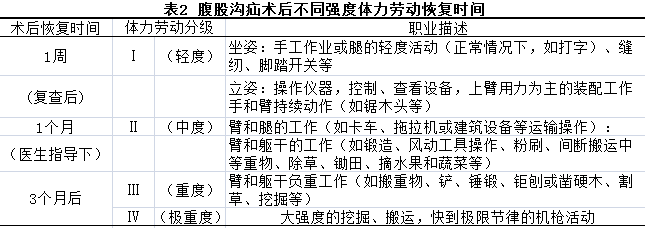 中青年人可以根据工作性质酌情复工。根据《体力劳动强度分级》,建议腹股沟疝术后不同强度体力劳动恢复时间,见表2。