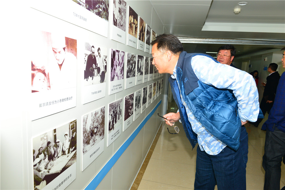 下图为樊世彬夫妇在住院大楼七楼细看文化长廊