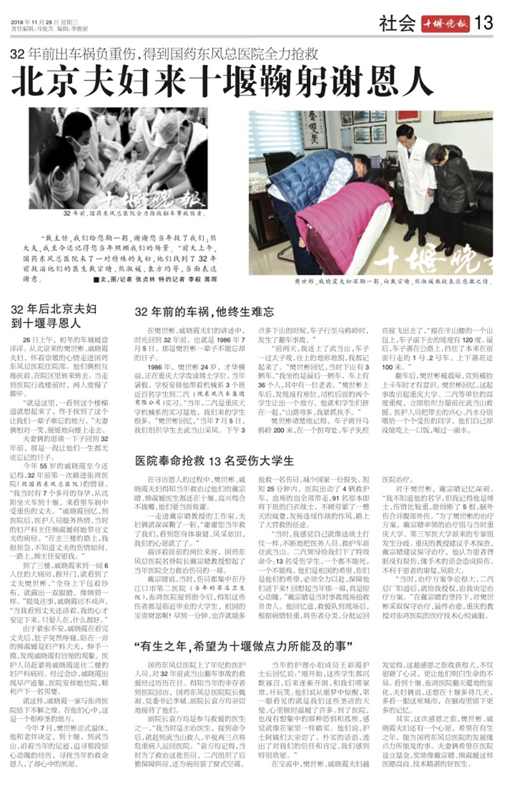 端详着面前的两位来访者,戴宗晴教授想起了当年医院全力救治武当山严重翻车事故伤员的一幕。