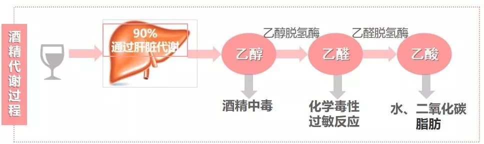 乙醇进入消化道后,会随着由消化道发出的静脉汇集到门静脉,再流进肝脏,在肝细胞内的乙醇脱氢酶的作用下代谢成乙醛, 进而代谢成乙酸、最后分解成水和二氧化碳排出体外。
