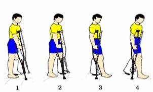 1、将双拐支撑在双脚两侧的下方,双拐同时向前移动;