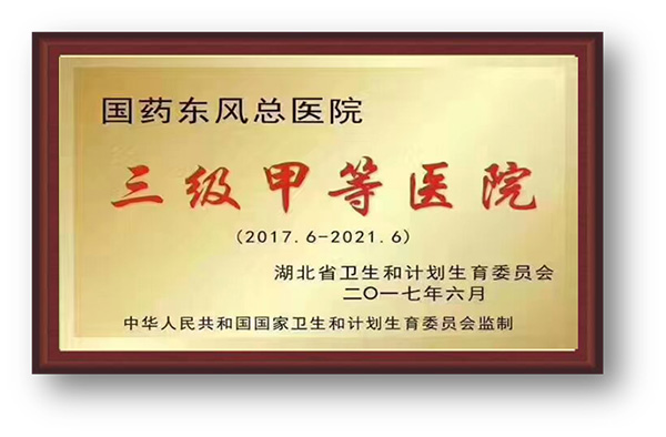 2017年5月25日,国药东风总医院顺利通过三甲医院复审。这是医院自1994年在本地区率先进入国家三级甲等医院行列以来,在长达23年的时间跨度里,其综合实力始终保持在全国地市级医学领域第一方阵,在本地区保持领先水平的力证。